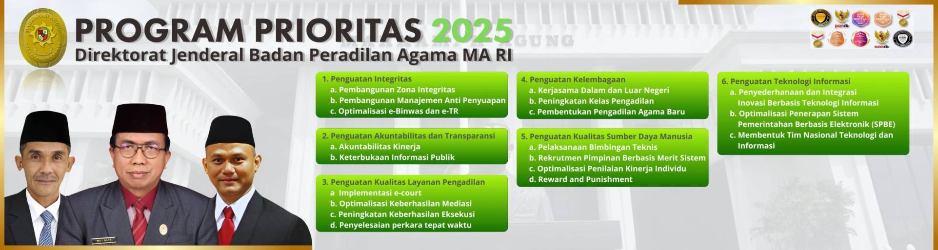 Berikut adalah 4 (empat) motto substantif yang menggambarkan semangat, identitas, dan komitmen Pengadilan Agama Indonesia: