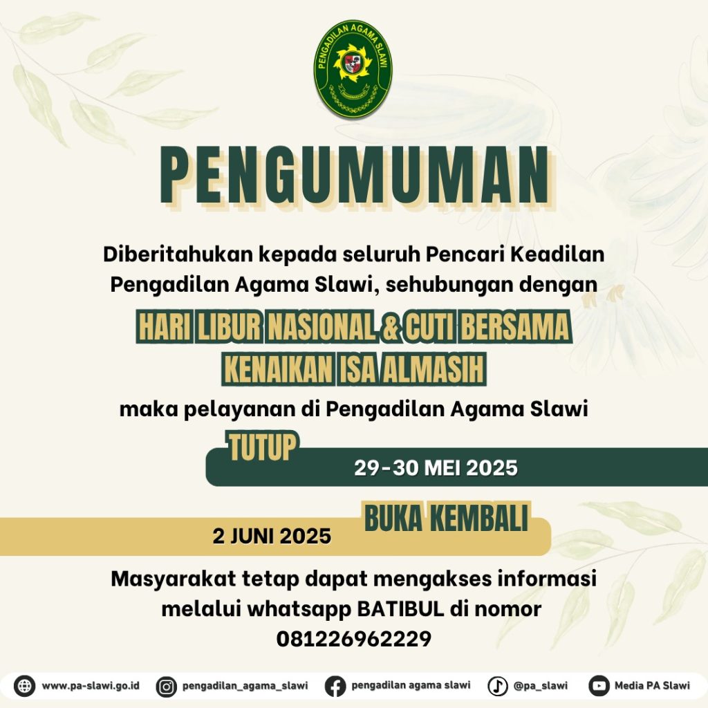 PELANTIKAN KETUA PENGADILAN AGAMA SLAWI KELAS IA Pada hari Jum’at, tanggal 4 Juli 2025 Dr. Khairunnas, S.Ag., M.H. resmi menjadi Ketua Pengadilan Agama Slawi setelah dilaksanakannya Pengambilan Sumpah Jabatan dan Pelantikan Ketua Pengadilan Agama Slawi oleh Ketua Pengadilan Tinggi Agama Semarang Dr. Hj. Rokhanah, S.H., M.H., Pelantikan ini didasari dengan Surat Direktur Jenderal Badan […]