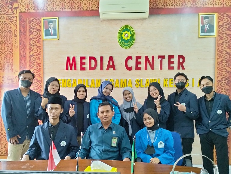 Rabu pagi tanggal 25 Januari 2023, Wakil Ketua Pengadilan Agama Slawi Azimar Rusydi, S.Ag., M.H. menerima kedatangan 10 (sepuluh) orang Mahasiswa yang akan melaksanakan kegiatan Magang di Pengadilan Agama Slawi. Dari 10 (sepuluh) orang mahasiswa tersebut 2 (dua) orang berasal dari Universitas Islam Negeri Syarif Hidayatullah Jakarta Jurusan Hukum Keluarga yang akan melaksanakan kegiatan magang selama kurang lebih 4 (empat) minggu. Selanjutnya 8 (delapan) orang mahasiswa lainnya berasal dari Universitas Islam Negeri Sunan Gunung Djati Bandung, dimana 7 (tujuh) orang mahasiswa Jurusan Hukum Ekonomi Syariah akan melaksanakan kegiatan magang selama kurang lebih 2 (dua) minggu dan 1 (satu) orang mahasiswa Jurusan Ilmu Hukum akan melaksanakan kegiatan magang selama kurang lebih 4 (empat) minggu. Penyambutan sederhana ini berlokasi di ruang Media Center Pengadilan Agama Slawi.